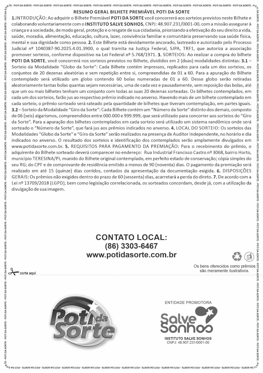 O Bilhete Premiável POTI DA SORTE é uma campanha filantrópica promovida pelo INSTITUTO SALVE SONHOS: Instituto Salve Sonhos Financiamento Coletivo (“SALVE SONHOS”), ao adquiri-lo você está colaborando para a SALVE SONHOS realizar os seus objetivos filantrópicos de assegurar às crianças e à sociedade a proteção e o resgate à cidadania, bem como ajudando as instituições conveniadas, a exemplo da ASSOCIAÇÃO CASA DA ESPERANÇA E VIDA DE ASSISTÊNCIA AS PESSOAS COM CÂNCER, e, ainda, concorre a valiosos prêmios. Os bens oferecidos como prêmio são meramente ilustrativos. Antes de adquirir o Bilhete Premiável POTI DA SORTE, consulte previamente o Regulamento/Condições Gerais.